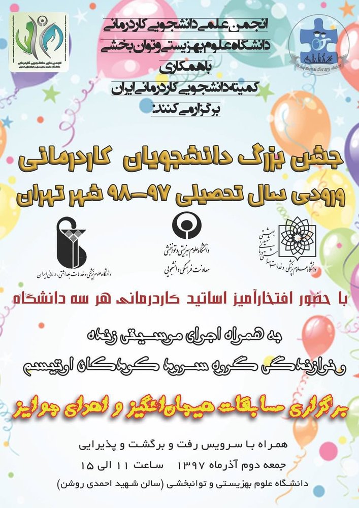 به گزارش وبدای دانشگاه بهزیستی و توانبخشی بنقل از مفدا؛ " سید سپهر بطحائیان " دبیر انجمن علمی دانشجویی کار درمانی دانشگاه علوم بهزیستی و توانبخشی در این باره  گفت : جشن مشترک ورودی‌های کاردرمانی سه دانشگاه مستقر در تهران به همت انجمن علمی دانشجویی دانشگاه علوم بهزیستی و توانبخشی و با همکاری کمیته دانشجویی کاردرمانی ایران ، از ساعت 11 روز جمعه دوم آذرماه ، با حضور دانشجویان و اساتید حوزه کاردرمانی  برگزار می شود.