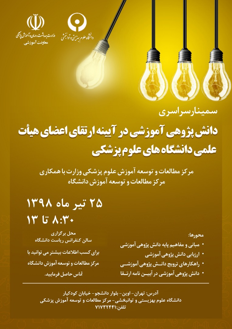 سمینار سراسری "دانش پژوهی آموزشی در آیینه ارتقای اعضای هیات علمی " دانشگاه های علوم پزشکی، فردا (سه شنبه) برگزار می شود