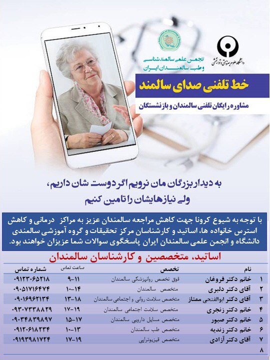 عضو هیات علمی دانشگاه علوم بهزیستی و توانبخشی و رئیس انجمن علمی طب سالمندان و سالمند شناسی ایران اعلام کرد: خدمات پویش «مقابله با کرونا، فرصتی برای همدلی با سالمندان»، که برای پاسخگویی به سئوال ها و کاهش اضطراب سالمندان شکل گرفته است، بصورت غیرحضوری و رایگان ارائه می شود.