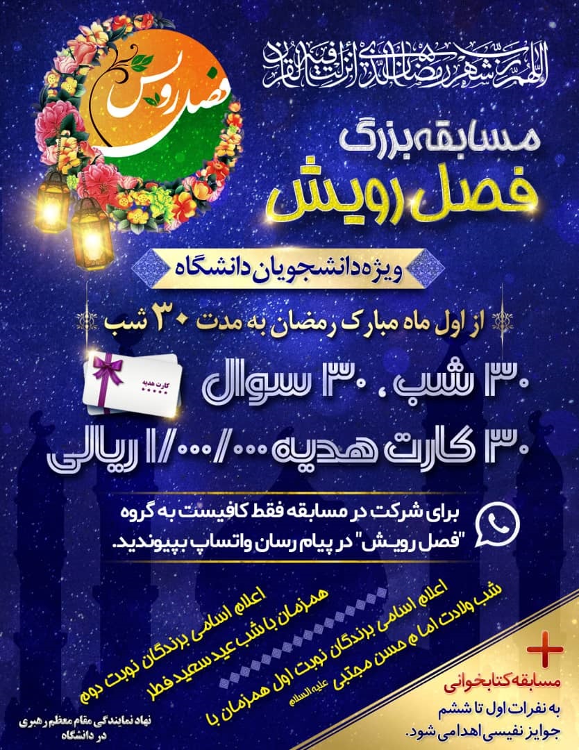 لازم به ذکر است که پس از ارائه هر کلیپ در هر شب ، سوال مطرح می شود و در مجموع این 30 شب، به 30 نفر از برندگان، 30 کارت هدیه، در دو سطح دانشجویی و کارمندی اهداء خواهد شد.