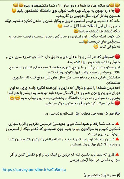 براساس این اطلاعیه، لینک http://survey.porsline.ir/s/Cu3mlta برای برقراری ارتباط با دانشجویان جدید الورود دانشگاه و تقسیم بندی آنان براساس رشته تحصیلی و شرایط هر یک، جهت همراهی بهتر و مناسب تر، اعلام شده است.