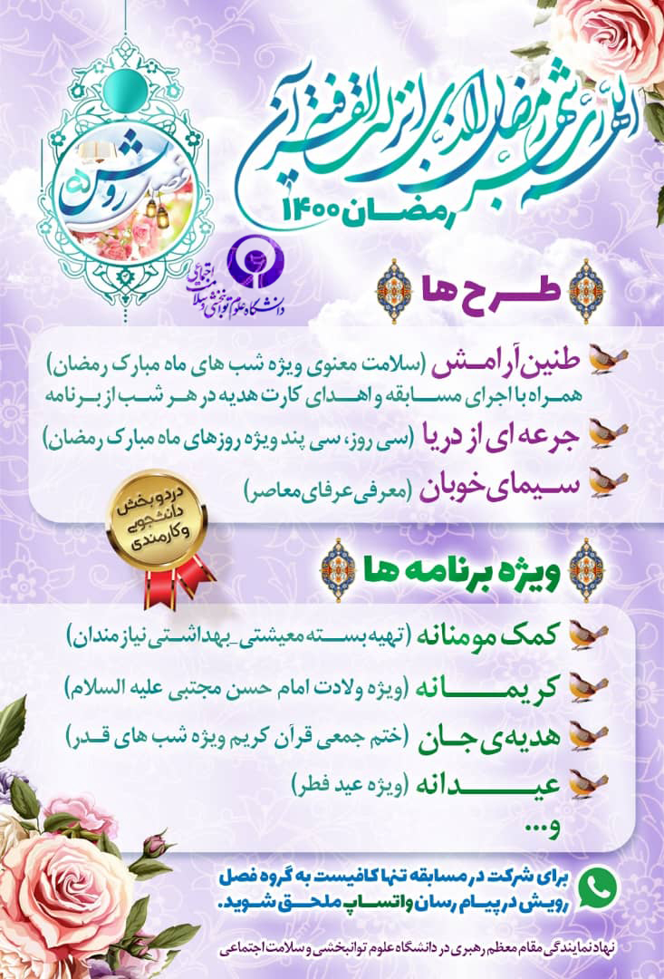فصل رویش (5) ویژه ماه مبارک رمضان با ارائه محتواهای دینی، فرهنگی و ... در بستر فضای مجازی برای خانواده بزرگ دانشگاه علوم توانبخشی و سلامت اجتماعی برگزار خواهد شد.