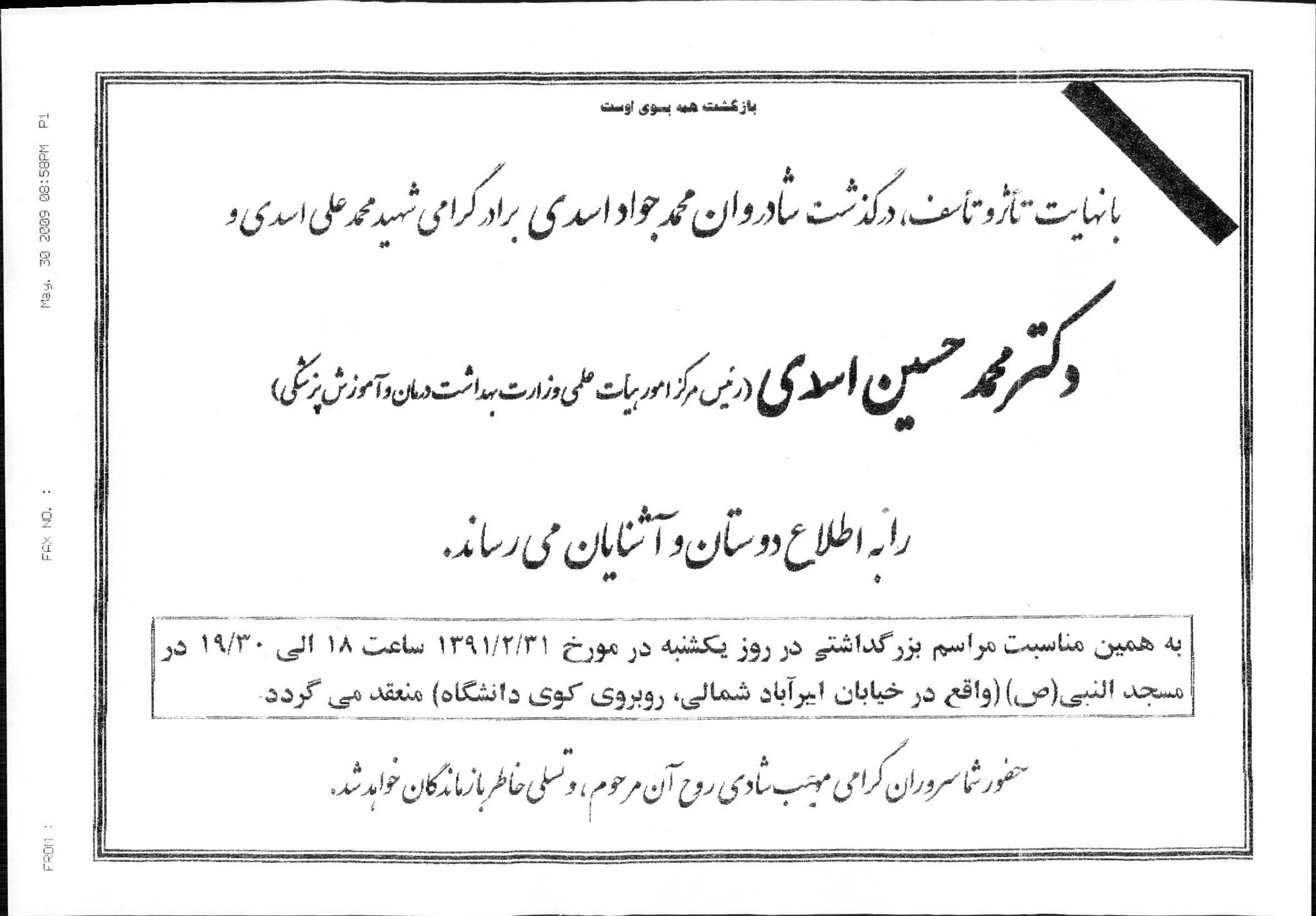 اخبار > درگذشت شادروان محمد جواد اسدی برادر گرامی شهید محمدعلی اسدی و دکتر محمد حسین اسدی ( رییس مرکز امور هیات علمی وزارت بهداشت درمان و آموزش پزشکی)