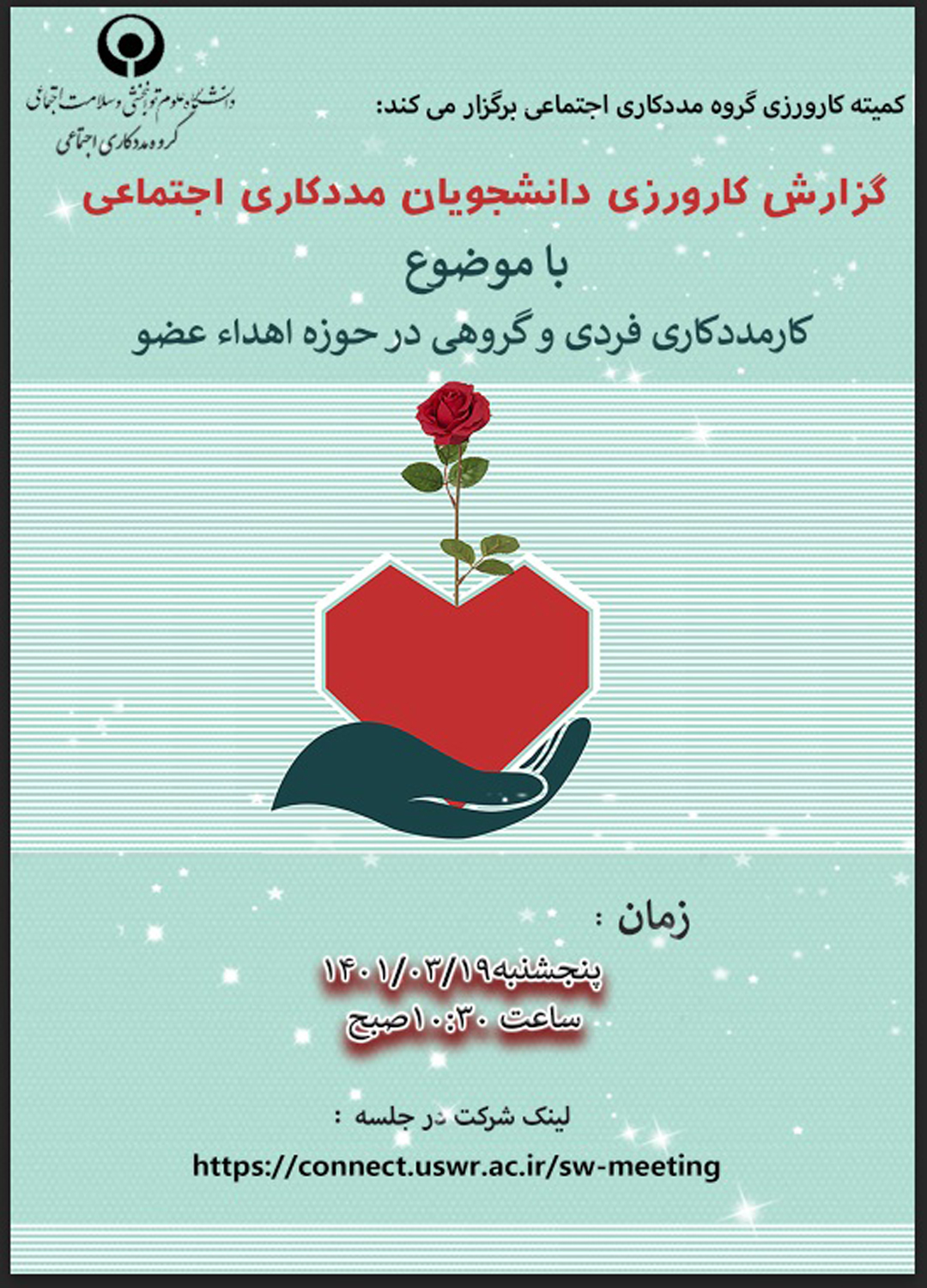 گروه آموزشی مددکاری اجتماعی دانشگاه علوم توانبخشی و سلامت اجتماعی طی اطلاعیه ای اعلام کرد: کمیته کارورزی این گروه، گزارش کارورزی دانشجویان مددکاری اجتماعی با موضوع « کار مددکاری فردی و گروهی در حوزه اهدای عضو » را طی نشستی بصورت مجازی ارائه می کند.