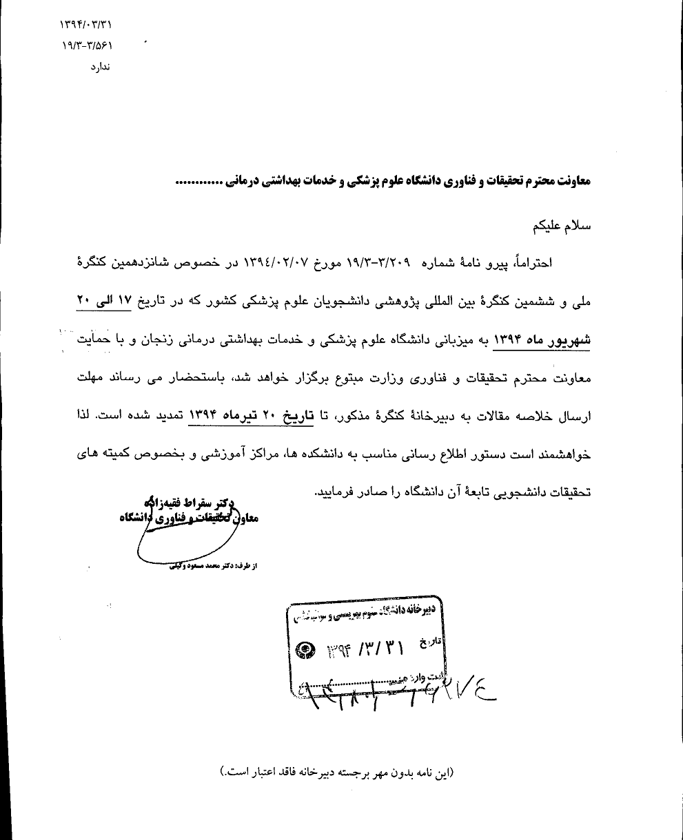 معاونت تحقیقات و فن آوری اطلاعات :مهلت ارسال خلاصه مقاله به دبیرخانه ششمین کنگره بین المللی پژوهشی به میزبانی دانشگاه علوم پزشکی زنجان تمدید شد.