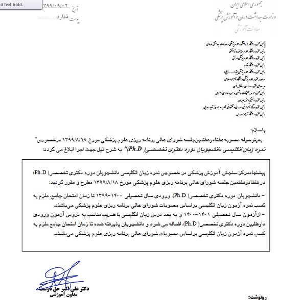 آئین نامه نمره زبان انگلیسی برای دانشجویان دکترای ورودی 99-400 و بعد آ